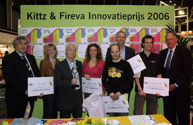 Foto van de prijswinnaars uit de inzendingen voor de Kittz/Fireva-prijs en Hans Dijkstal, die deze prijzen uitreikte.