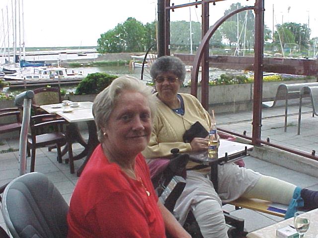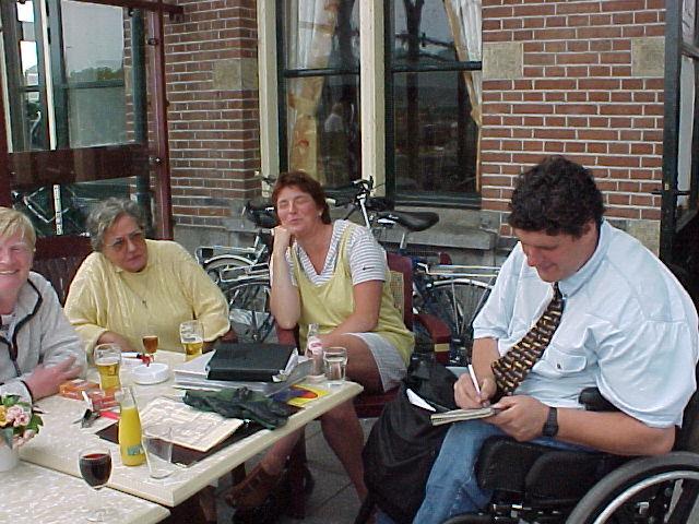 Twee weken daarvoor ging zij mee met 'Stadsmobiel', het collectief vervoer in Amsterdam en brak haar been. Ze maakte de rit op8 mei. "De rolstoel stond weliswaar klem", vertelt ze, "maar was niet vastgezet. Ik had ook geen gordel om". Toen de chauffeur plotseling moest remmen, schoot zij uit haar rolstoel en sloeg met haar been tegen een ijzeren stang. Zij werd per brancard naar het ziekenhuis vervoerd. Haar been bleek gebroken. "Dat de rolstoel niet was vastgezet en dat ze geen gordel om had gekregen is ook uw eigen verantwoordelijkheid", zo zei de Wvg-advocaat die ze raadpleegde. U bent dus gewaarschuwd. 1) De aanwezigheid van Nellie Korsen was een even grote prestatie. Nellie Korsen is een afasi-patiënte. Drie jaar geleden kreeg zij tijdens een vakantietrip in Spanje een herseninfarct en lag vijf dagen in coma in een Spaans ziekenhuis. "Het je niet kunnen uiten, het niet te kunnen vertellen dat je pijn hebt. Niets kunnen uiten", vond ze het moeilijkste. Rechtzijdig verlamd gaat het spreken haar nog moeilijk af. Ze moest twee weken wachten voor ze naar Nederland mocht worden overgevlogen. Het werd eerst een verpleeghuis. Het is nu drie jaar geleden en sinds anderhalf jaar woont ze weer zelfstandig. Ze oefent met de fysiotherapeut zelfs alweer tweemaal per week met traplopen. "En kijk eens", zegt ze, "mijn rechterhand was helemaal spastisch, maar ik kan hem weer bewegen". Ze laat het zien. "Ik zál beter worden", voegt de 59-jarige eraan toe. "De artsen vinden mij een prachtvrouw". Tom Nout kwam ze tegen in het ziekenhuis in Alkmaar. Ze hoorde van de actie en kwam naar Enkhuizen. Ze had een taxi besteld voor elf uur. Twee uur later kwam de taxi haar ophalen. Een volgend verhaal op het terras in Enkhuizen. Een